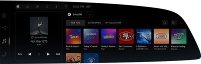 To access content on third-party media applications, tap on the Right Clearview Cockpit and select the intended application from the drop-down menu. From the Right Clearview Cockpit, you can browse your content through app-specific lists, such as Recents, Explore, Favorites, and Library, and access media controls, such as forward, backward, play, and pause.