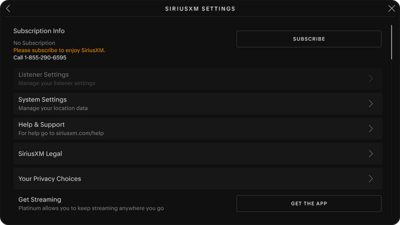 From the Pilot Panel, tap Settings to display the SiriusXM settings.