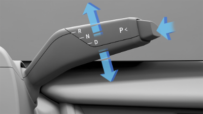 With the vehicle in P Park or N Neutral, move the right steering column lever up or down to select Reverse or Drive. The Center Cockpit Panel shows the current selection. When in Park, you must also press the brake pedal before selecting D Drive or R Reverse.