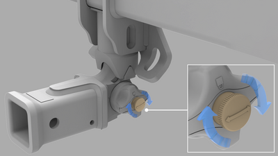 Take hold of the bottom of the hitch, pull on the locking cylinder, and turn it clockwise until the red mark on the cylinder aligns with the white dot on the hitch receiver. Be sure not to drop the hitch receiver. The hitch should detach from the socket and fall out of the hitch housing unit.
